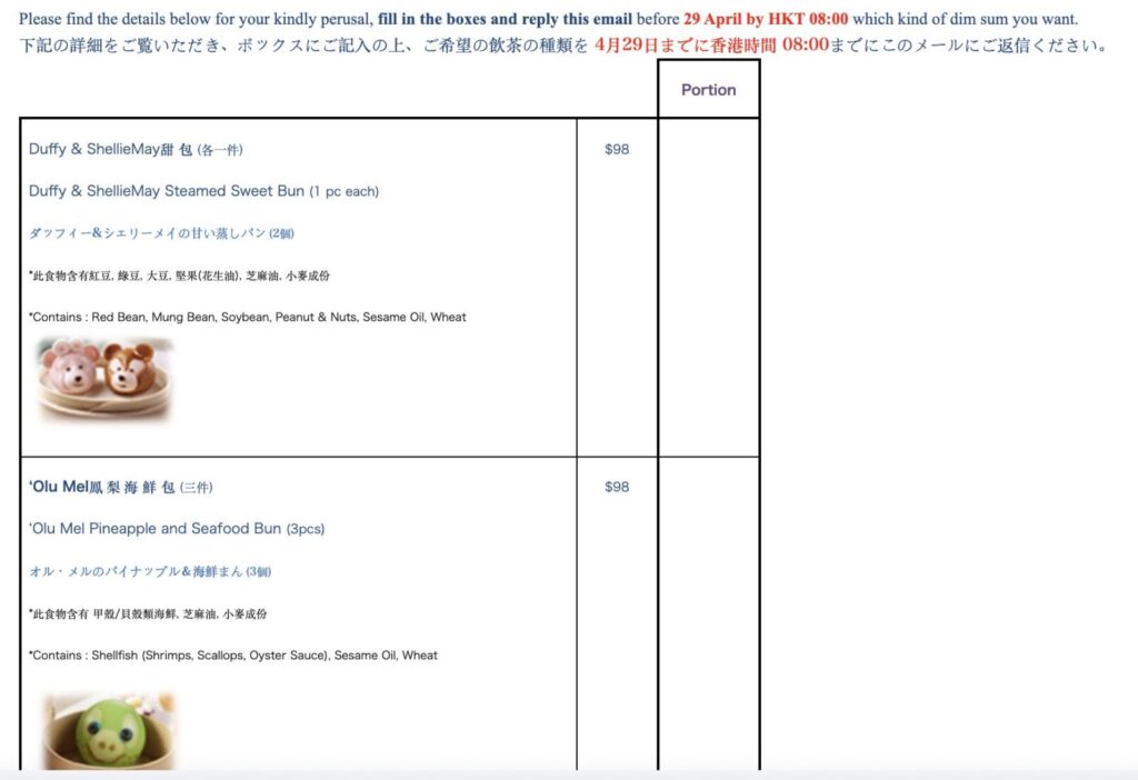公式サイトで予約が完了したら、予約確認メールが届くんだけど、その時に他に追加したい飲茶がないか聞かれるので、メールの表に注文したい皿数を記入して返信する!